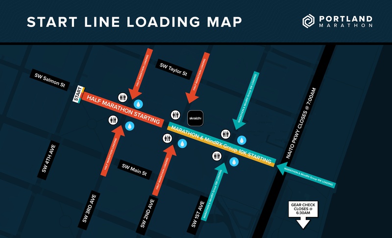 Marathon & 10K: Assemble on SW Salmon St between SW 2nd Ave and Naito Pkwy. Self-organize by pace, with faster runners near SW 2nd. Start time: 7:15 AM.