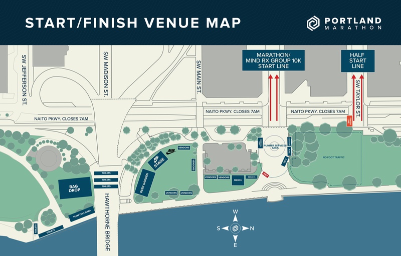 The marathon, half marathon, and 10K start and finish at the same location. The pre-race staging area is located in Portland's Waterfront Park at 1000 SW Naito Pkwy. Dozens of hotels are located within walking distance of the venue and runners staying at those hotels are encouraged to leave their cars at their hotels. Portlanders and others who plan to arrive at the start venue from farther away and require parking facilities for their cars are encouraged to plan for at least 45 minutes to park their car and walk to the start venue after arriving in downtown. Please utilize the Portland Marathon Parking Map to identify nearby parking facilities and keep in mind that these facilities require payment.