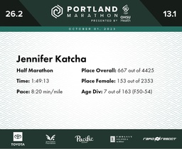 | Finish | 13.1 | 1:49:13 | 8:20/miles | 1.2 | 10:05 | 8:23/miles | 667 | 153 F | 7 F50-54 |