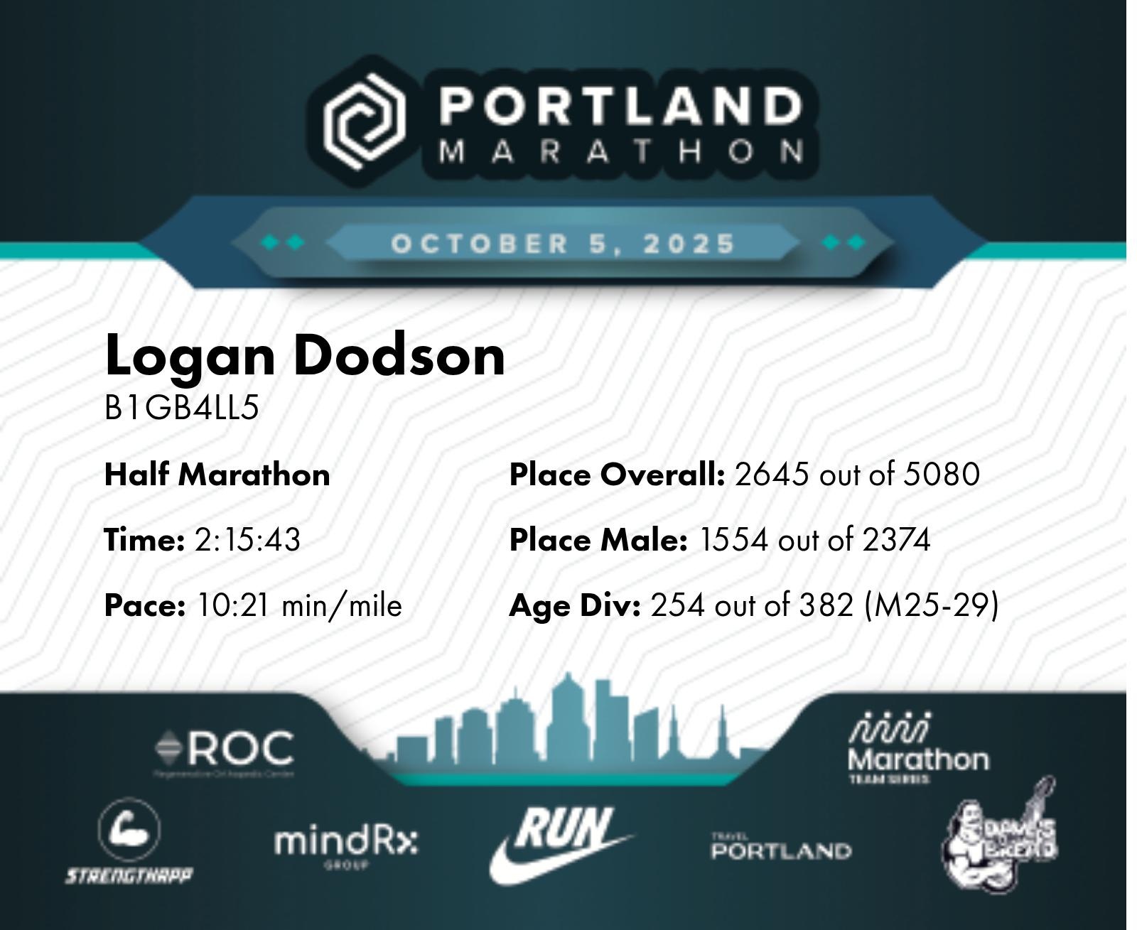 Date: Oct. 5, 2025 Participant: Logan Dodson #14982 Race: 2025 Portland Half Marathon Distance: 13.1 miles