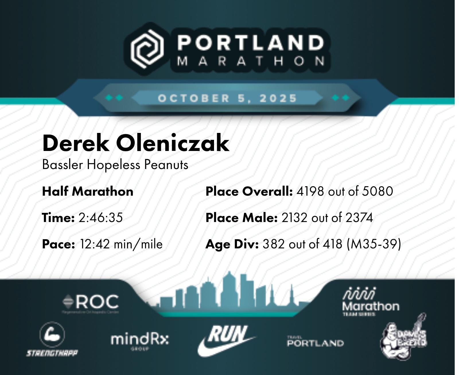 Date: Oct. 5, 2025 Participant: Derek Oleniczak #17010 Race: 2025 Portland Half Marathon Distance: 13.1 miles