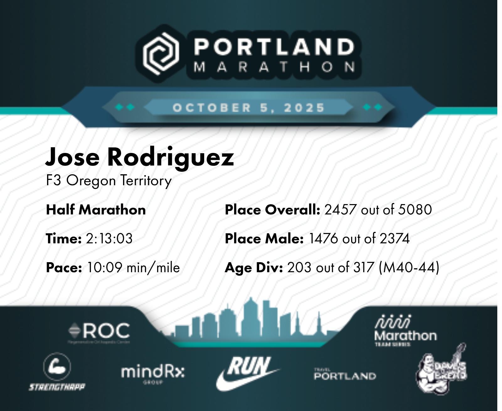 Date: Oct. 5, 2025 Participant: Jose Rodriguez #17448 Race: 2025 Portland Half Marathon Distance: 13.1 miles