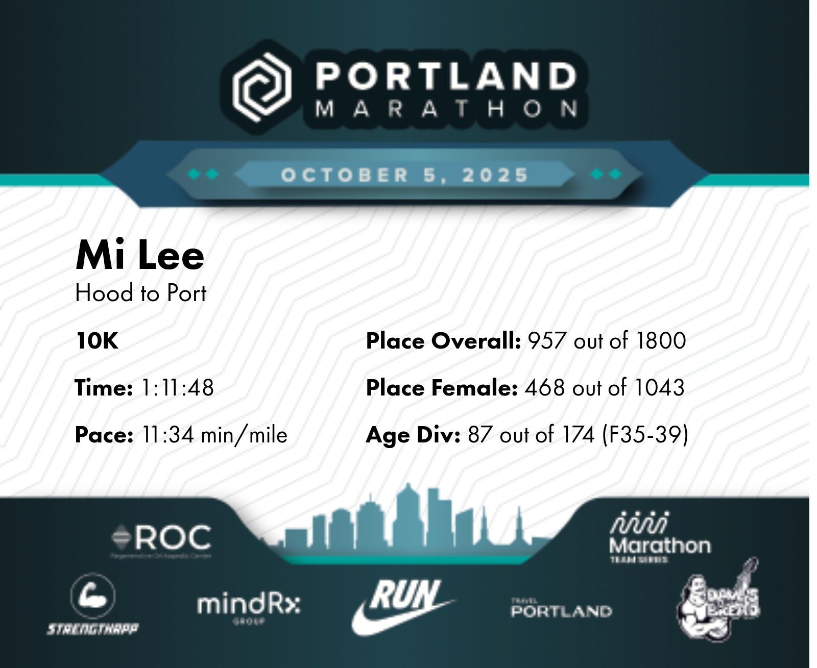 Date: Oct. 5, 2025 Participant: Mi Lee #20703 Race: 2025 Portland 10K MindRX Group Distance: 6.2 miles