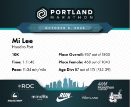 Consistent Pace and Strong Finish Mi Lee participated in the 2025 Portland Marathon’s 10K MindRX Group, finishing in 1:11:48 with a steady average pace of 11:34 min/mile. Notably, her first two miles were impressively consistent, both clocking in at 11:16 min/mile. The middle miles (3 through 5) maintained a slightly slower rhythm with splits of 11:51 min/mile. However, she managed to quicken her pace in the final stretch, achieving an 11:26 min/mile pace for the sixth mile. Overall, Mi's performance placed her 87th in her division, F35-39, and 955th overall out of 2114 participants. Comparatively, her pacing in this race was slightly slower than her past races documented in the half marathon category. Focusing on increasing her endurance and incorporating speed workouts could help Mi regain some of the pace seen in her faster half marathon times from 2018 and 2019. Keep up the hard work, Mi!