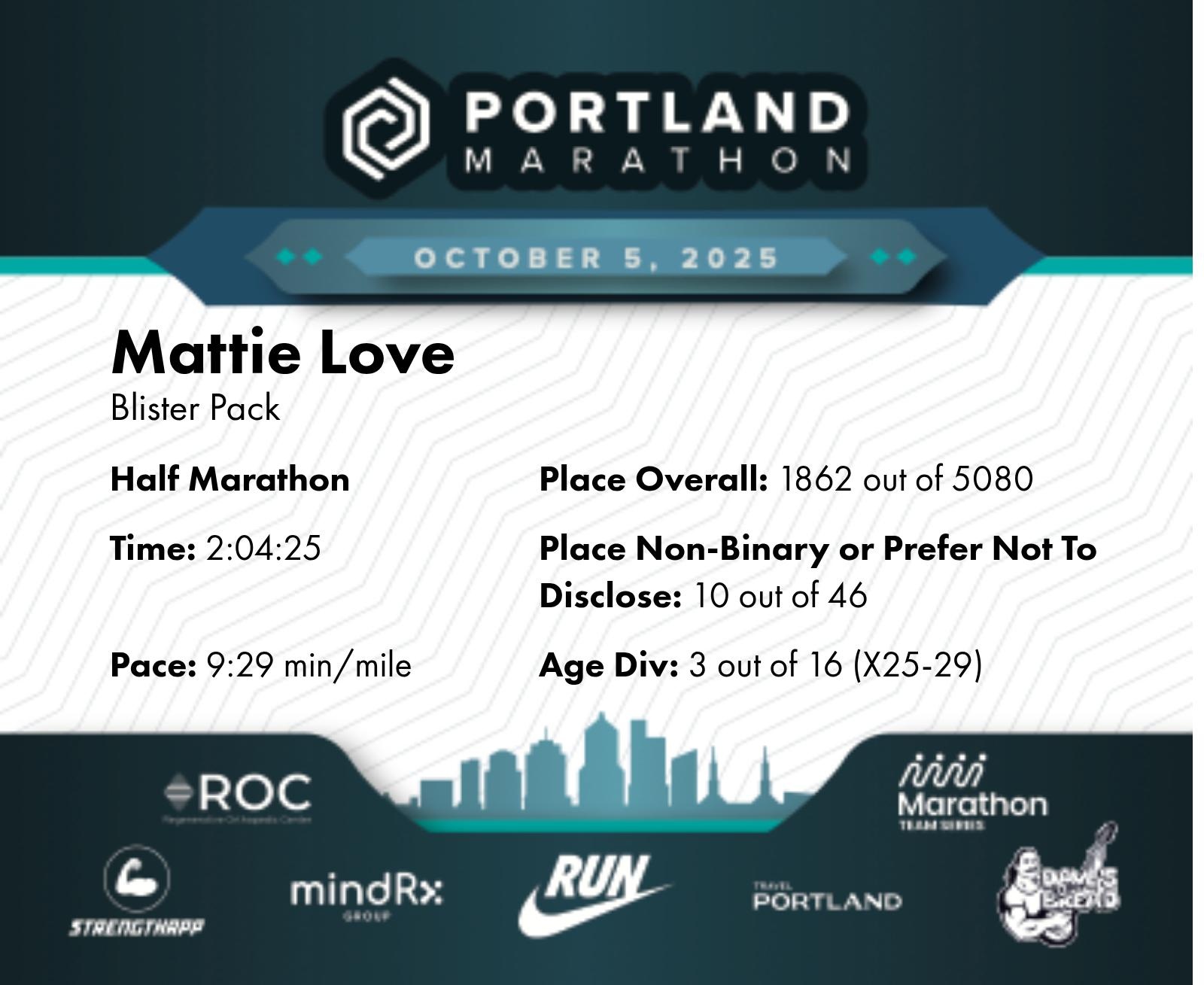 Date: Oct. 5, 2025 Participant: Mattie Love #16361 Race: 2025 Portland Half Marathon Distance: 13.1 miles