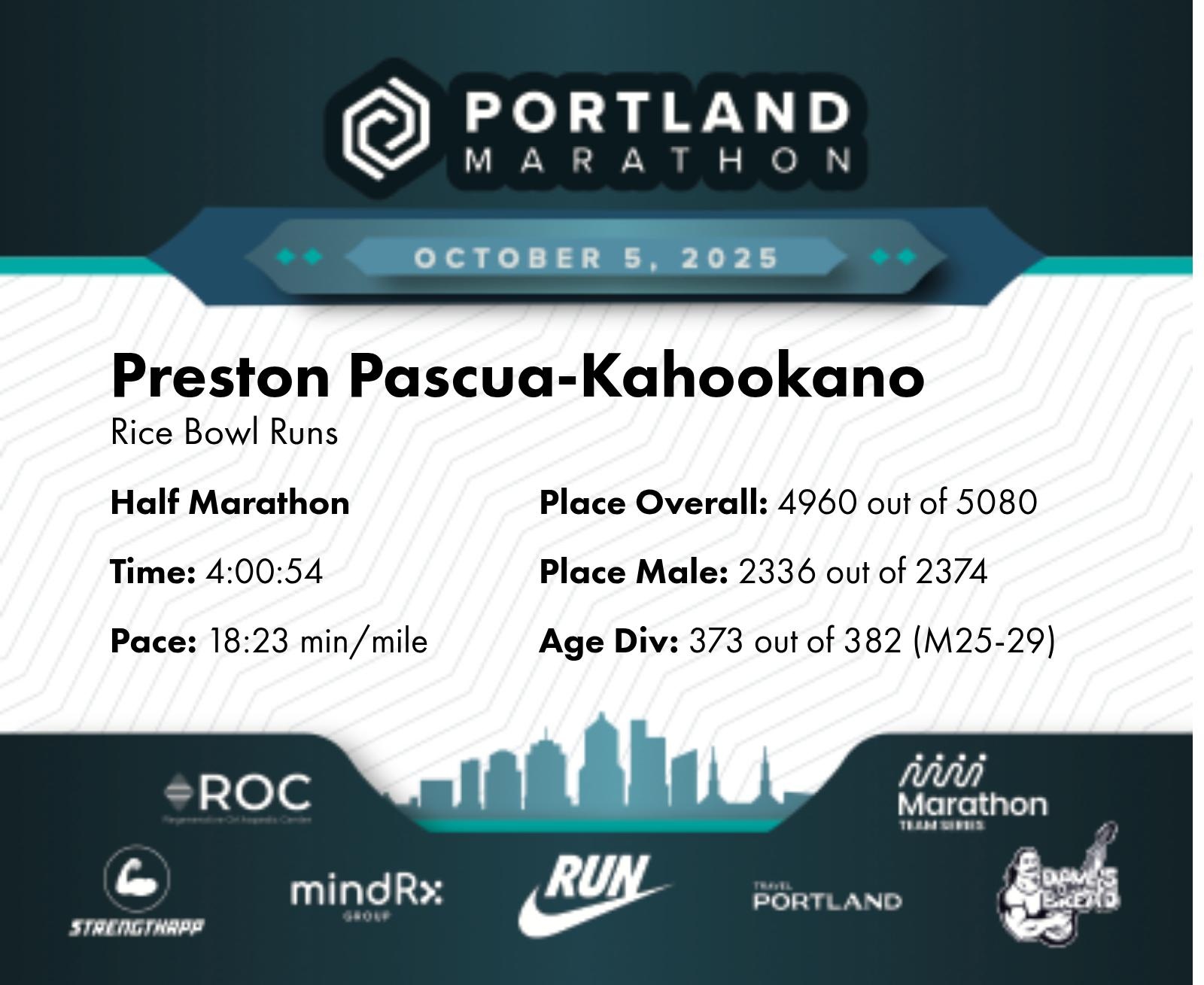 Date: Oct. 5, 2025 Participant: Preston Pascua-Kahookano #17115 Race: 2025 Portland Half Marathon Distance: 13.1 miles