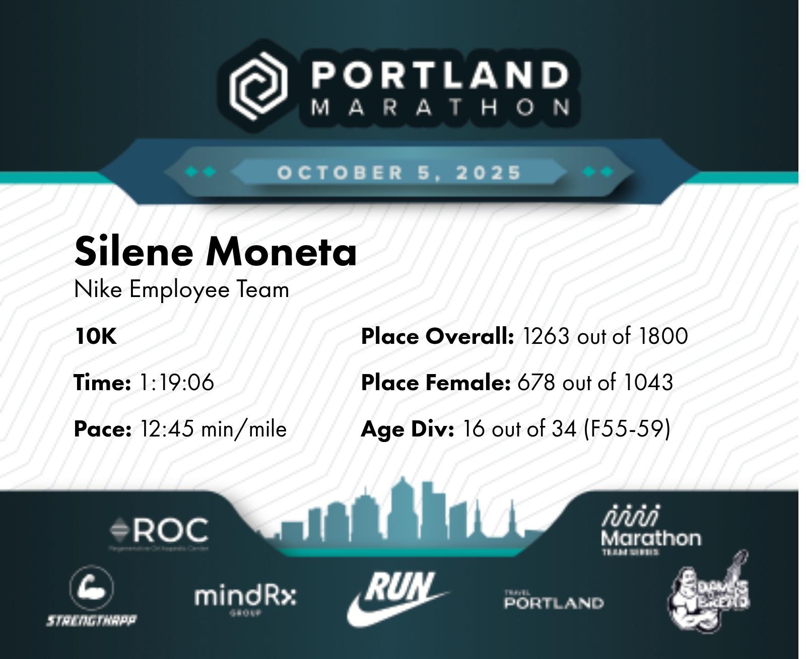 Date: Oct. 5, 2025 Participant: Silene Moneta #21983 Race: 2025 Portland 10K MindRX Group Distance: 6.2 miles