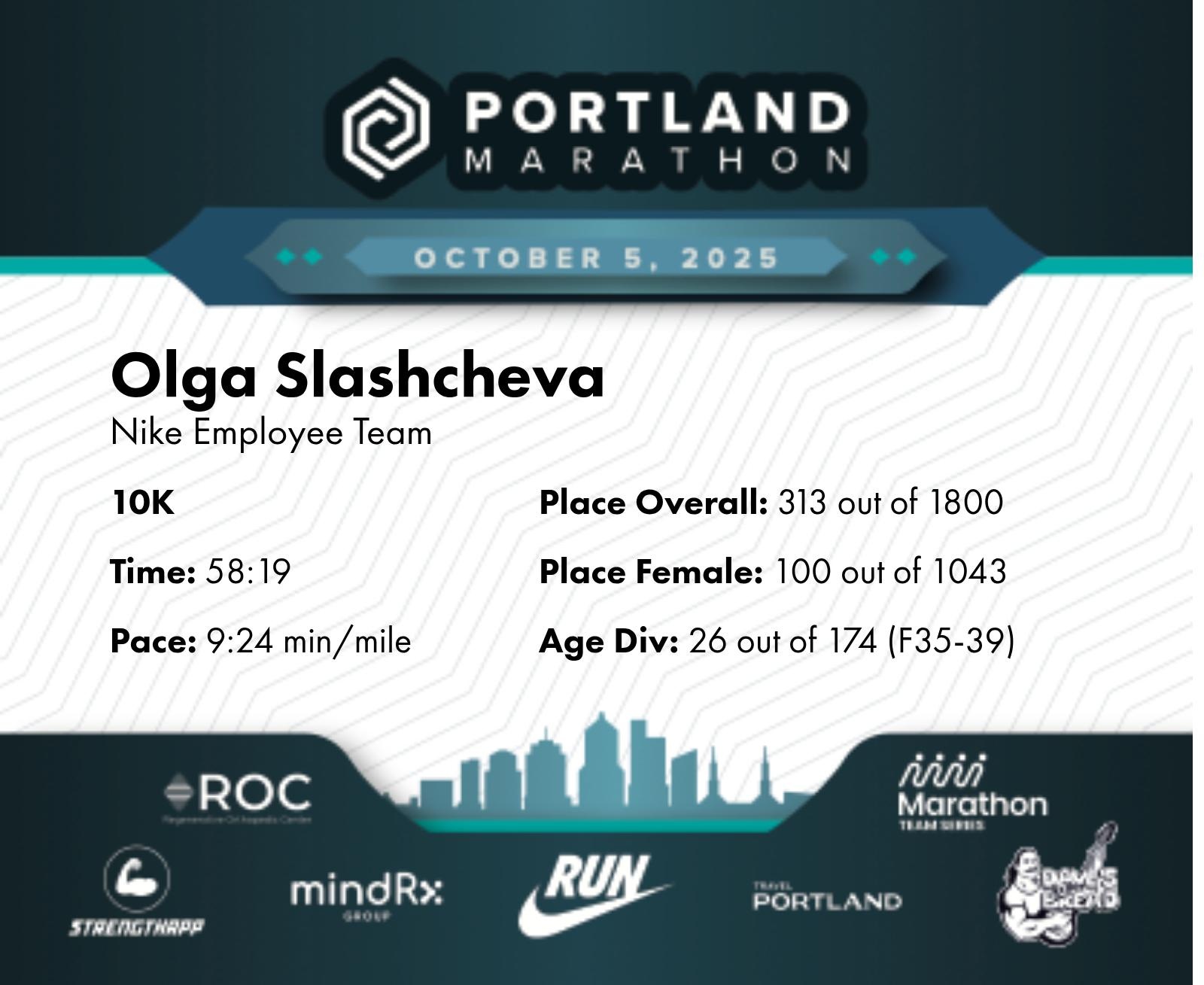 Date: Oct. 5, 2025 Participant: Olga Slashcheva #22324 Race: 2025 Portland 10K MindRX Group Distance: 6.2 miles
