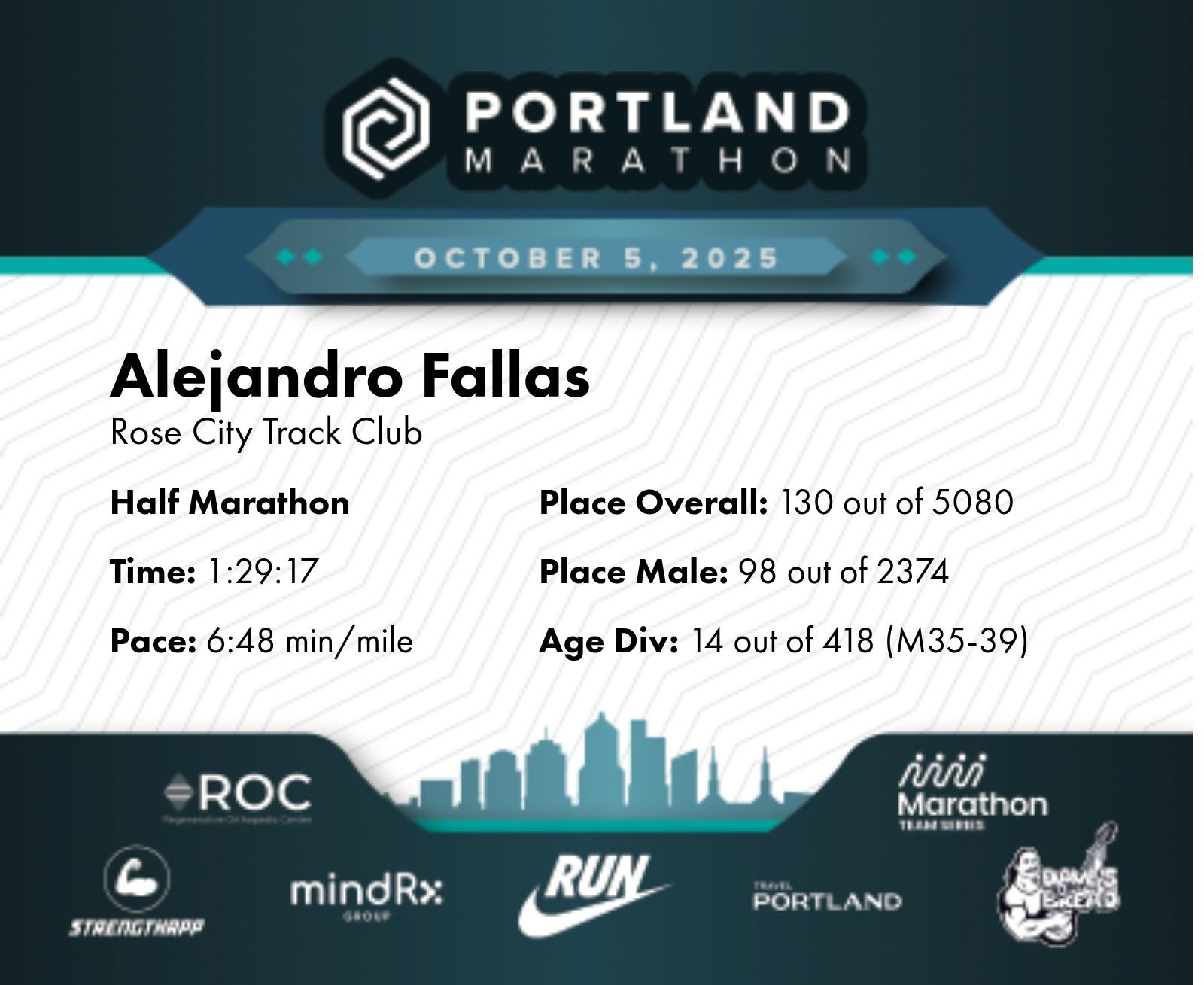 Date: Oct. 5, 2025 Participant: Alejandro Fallas #20530 Race: 2025 Portland Half Marathon Distance: 13.1 miles