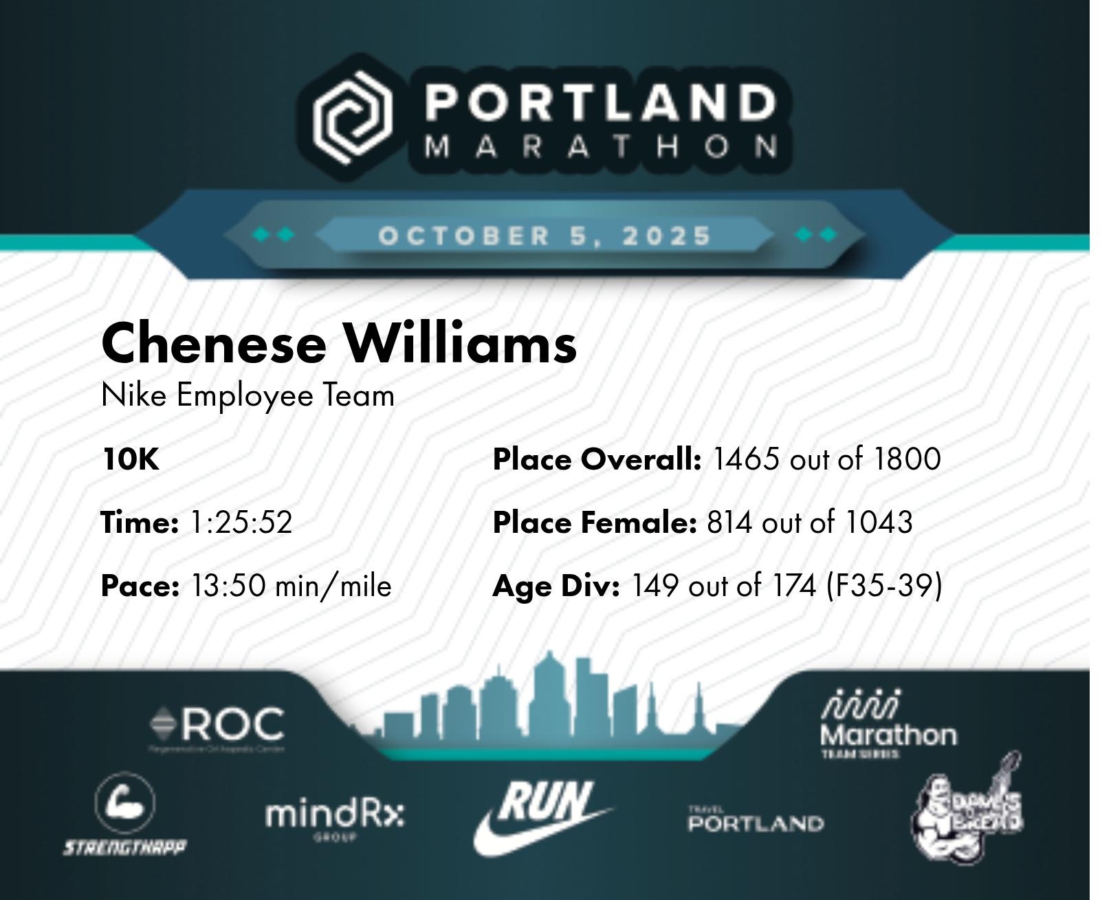 Date: Oct. 5, 2025 Participant: Chenese Williams #22503 Race: 2025 Portland 10K MindRX Group Distance: 6.2 miles