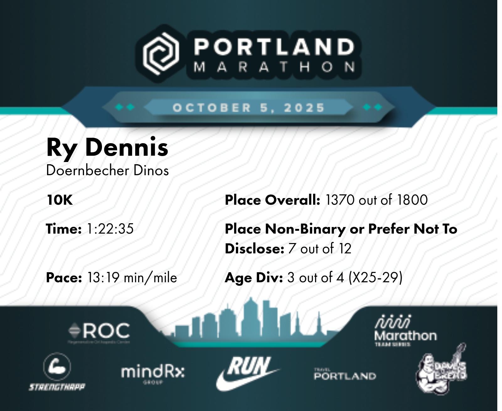 Date: Oct. 5, 2025 Participant: Ry Dennis #21334 Race: 2025 Portland 10K MindRX Group Distance: 6.2 miles