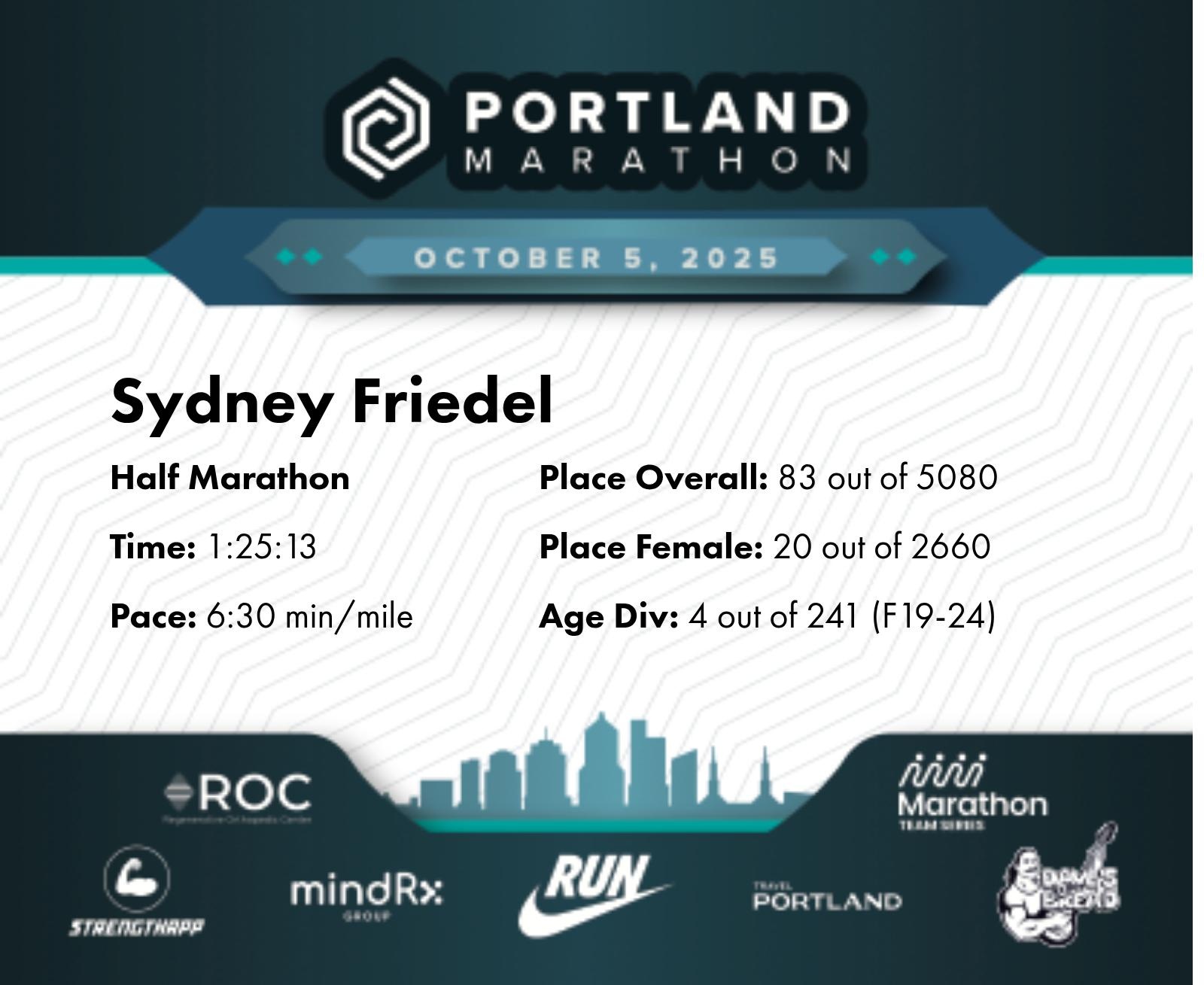 Date: Oct. 5, 2025 Participant: Sydney Friedel #15272 Race: 2025 Portland Half Marathon Distance: 13.1 miles