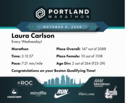 Date: Oct. 5, 2025 Participant: Laura Carlson #13196 Race: 2025 Portland Marathon Distance: 26.2 miles