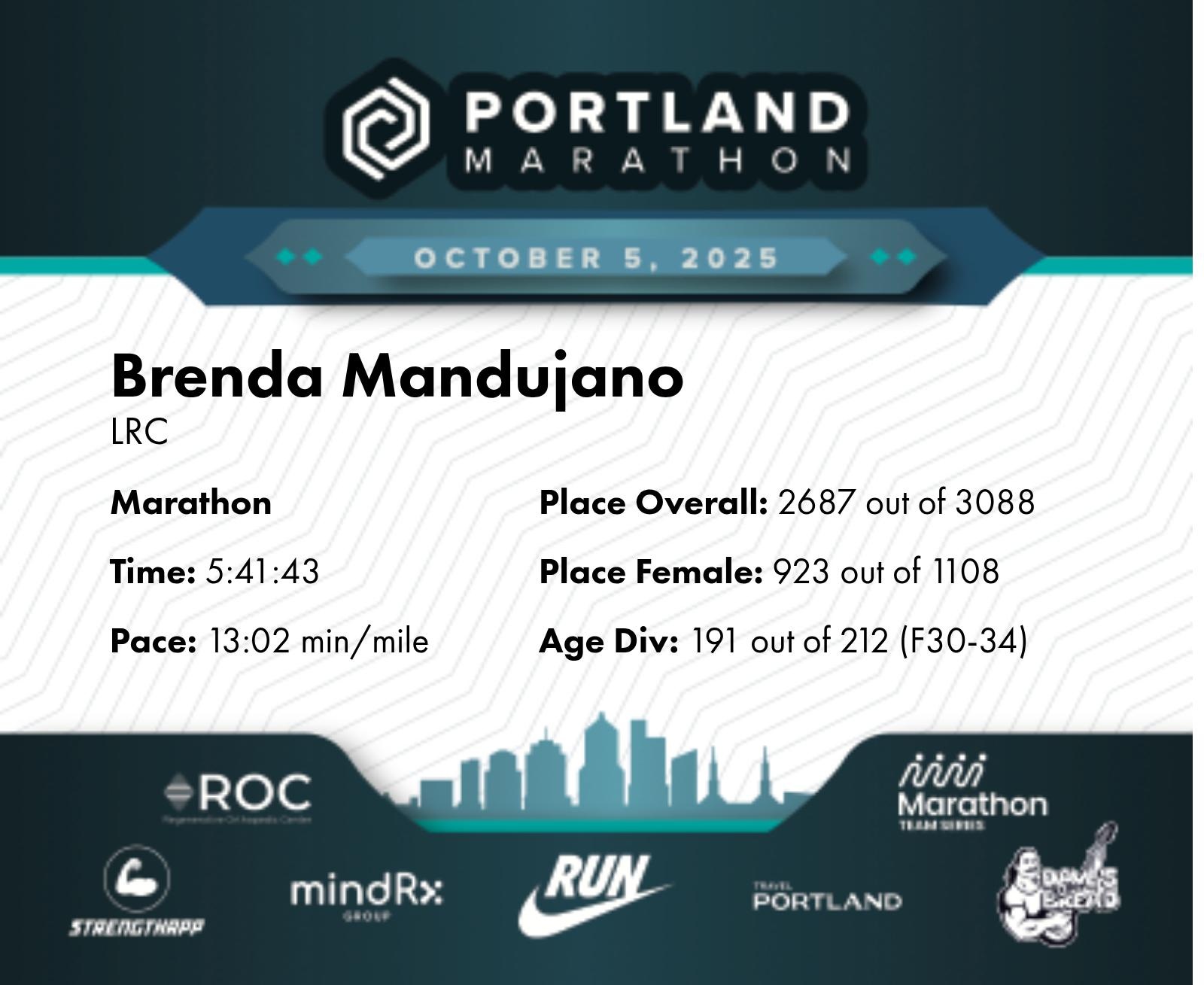 Date: Oct. 5, 2025 Participant: Brenda Mandujano #13323 Race: 2025 Portland Marathon Distance: 26.2 miles