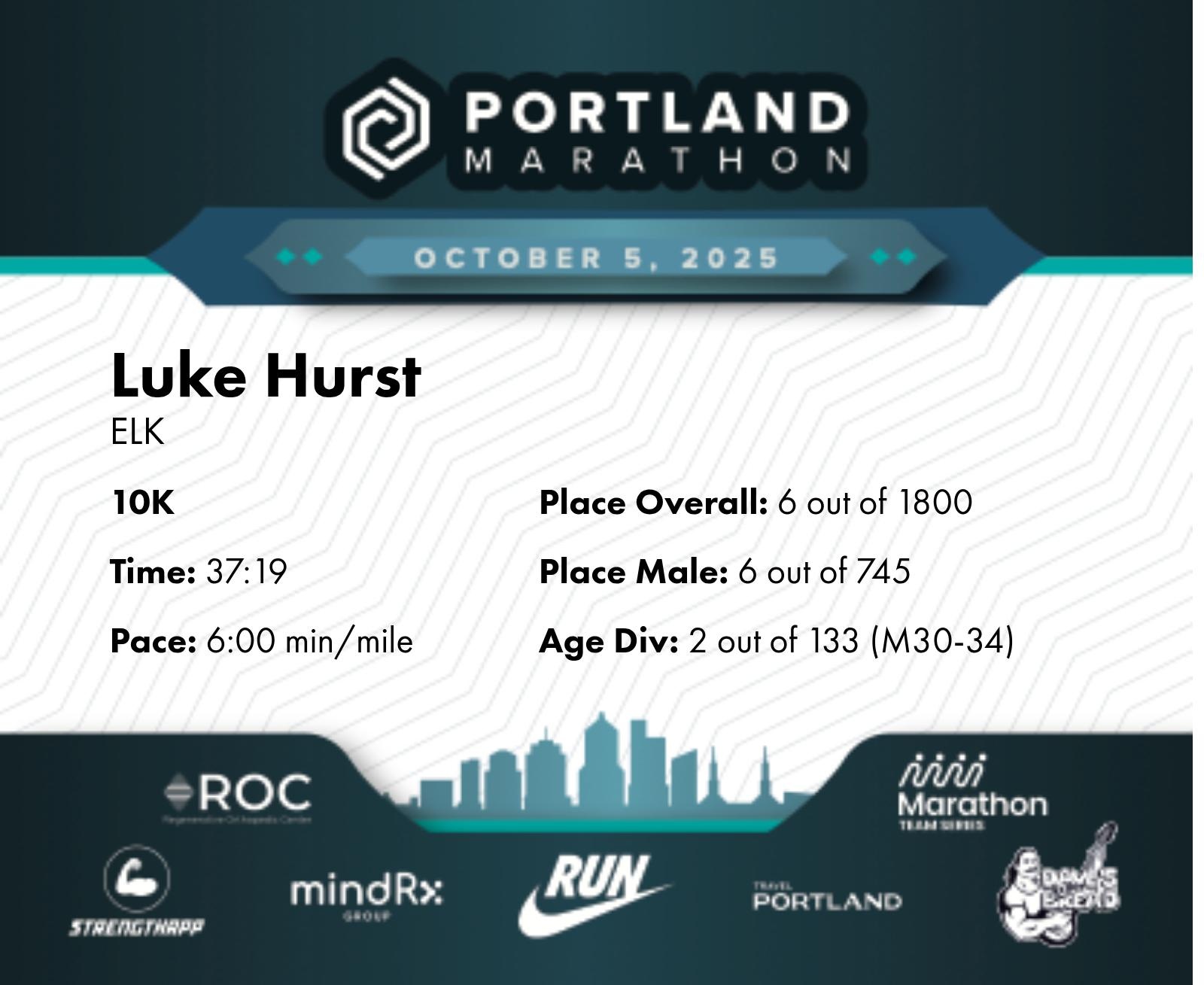 Date: Oct. 5, 2025 Participant: Luke Hurst #22695 Race: 2025 Portland 10K MindRX Group Distance: 6.2 miles