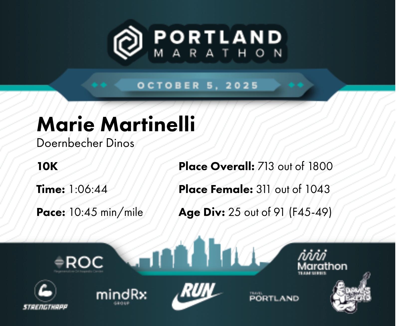Date: Oct. 5, 2025 Participant: Marie Martinelli #22748 Race: 2025 Portland 10K MindRX Group Distance: 6.2 miles