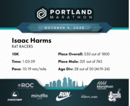 Consistent Progression with a Strong Mid-Race Surge Isaac Harms completed the 10K event at the 2025 Portland Marathon in an overall time of 1:03:59, maintaining an average pace of 10:19 min/mile. His performance was consistent, especially notable was the significant pace improvement during the fourth and fifth miles. Starting with consistent splits of 10:45 min/mile for the first two miles, Isaac showcased strategic pacing control. In the third mile, the pace slightly dipped to 11:13 min/mile, slipping in placement but this was followed by a strong improvement in the subsequent two miles, both clocking in at 9:49 min/mile. The fourth mile was particularly impressive, where Isaac ascended the rankings, moving from 683rd to 268th overall. This demonstrates Isaac's ability to effectively surge mid-race. Focusing on maintaining this later momentum earlier could offer further gains in future races. Overall, a strong performance as part of the R4T RACERS team.