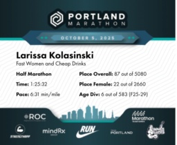 Date: Oct. 5, 2025 Participant: Larissa Kolasinski #20413 Race: 2025 Portland Half Marathon Distance: 13.1 miles